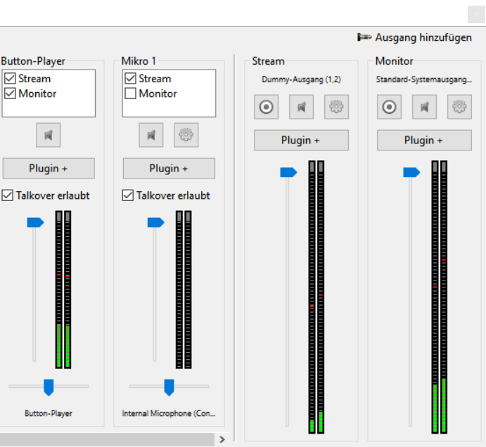 Auf der rechten Seite des Mixer-Fensters befinden sich die Ausgangskanäle. Du kannst so viele Kanäle hinzufügen, wie deine Hardware hergibt. Du kannst parallel verschiedene Soundkarten oder Interfaces und auch verschiedene Treiber (unter Windows ASIO und System) verwenden. Mit Dummy-Ausgängen schaffst Du Extra-Kanäle für Aufnahmen oder Deinen Livestream.